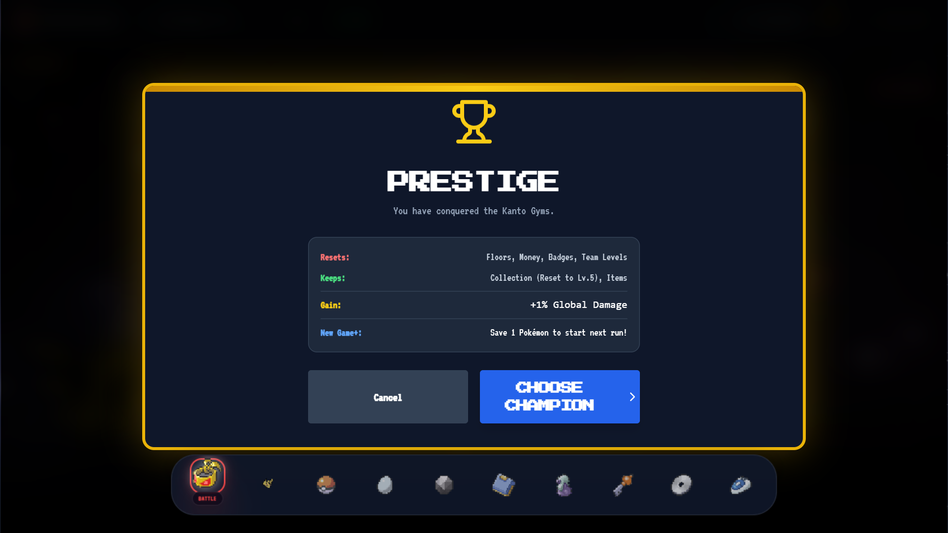 But I think being able to sell items like potions and evo stones for a % of the their buyable price would be nice as all your pokemon dying has very minimal consequences since you just get sent back by 1 floor so there's not much incentive to be healing your pokemon, I usually find my self having around 100+ of every item by the time I prestige so being able to sell them to get a little extra money to gamble with would be nice.